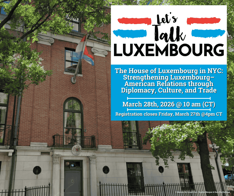 The House of Luxembourg in New York City serves as a central hub for Luxembourg’s economic diplomacy and cultural exchange in the United States. This two part program explores the House’s role in strengthening Luxembourg American relations through business development, innovation, and cultural engagement. Luc Decker, Consul General of Luxembourg and Executive Director of the Luxembourg Trade and Investment Office, will discuss his role in advancing economic diplomacy, while Laurence Pierron will present the history of the House itself, tracing its significance as a diplomatic and cultural landmark. Together, their presentations offer a comprehensive view of how the House of Luxembourg supports collaboration, investment, and long-standing transatlantic ties.